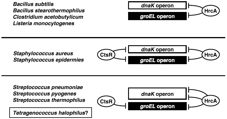 筆者らはこれまでに、T. halophilusから細菌の代表的な分子シャペロンであるdnaKおよびgroEL遺伝子のクローニング、およびその近傍の遺伝子解析を行った (図1)。いずれも他種グラム陽性細菌と同様、その近傍の遺伝子構造も類似しておりdnaKの上流にはリプレッサータンパク質遺伝子hrcA(heat regulation at CIRCE) およびgrpE、下流にはdnaJに高い相同性を示すopen reading frameの存在が確認された (図2)。groELに関しては、その上流にgroESに高い相同性を示すopen reading frameが存在した。これらの遺伝子はいずれもEnterococcus属由来のものと最も高い相同性を示した。また、hrcA上流に2つ、groES上流に1つのCIRCE (Controlling Inverted Repeat of Chaperone Expression) 配列が見出され、他種グラム陽性細菌の分子シャペロン同様、HrcA/CIRCEシステム (クラスⅠ型レギュロン、表2) による遺伝子発現制御の存在が示唆された (図3)。さらに最近では、DnaKと協調して働くことで凝集体のリフォールディングを促進するHSP104/ClpBという分子シャペロンの遺伝子クローニングと塩基配列の決定を行った。その結果、T. halophilus clpBはdnaK、groELと同様にEnterococcus属が保持するclpBと最も高い相同性を示した。また、プロモーター領域の塩基配列の比較より、この遺伝子はDnaK、GroELオペロンとは異なり、リプレッサータンパク質CtsR (class three stress gene repressor、クラスⅢ型レギュロン、表2) によって遺伝子発現が制御されていることが推定された (図4)。乳酸菌や枯草菌などのグラム陽性細菌では、このCtsRがClpファミリーに属するATP依存性プロテアーゼをコードする遺伝子の上流に位置するプロモーター領域に結合して、転写を負に制御することが明らかとなっている10,11)。