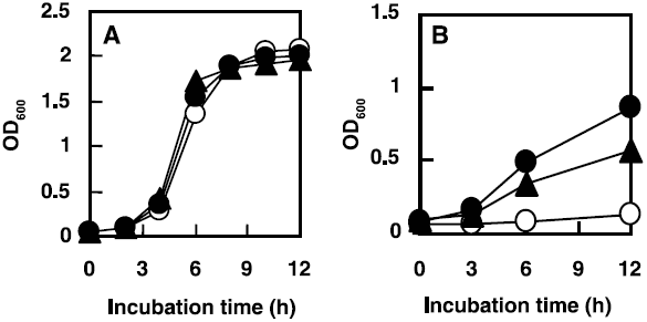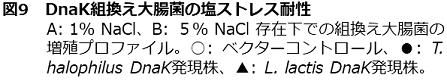 実際に我々は、T. halophilus Dnakを大腸菌内においてヘテロ発現することで、組換え大腸菌の耐塩性が向上するかその生育を検討した (図9)9)。非ストレス条件下 (1% NaCl) では、ベクターコントロールとT. halophilus Dnak発現株および比較に用いた非耐塩性乳酸菌L. lactis DnaK発現株の生育に顕著な差は見られなかった。これに対し、5% NaCl 以上の高塩ストレス条件下では、コントロールにおいて大幅な増殖の遅れが確認されたが、T. halophilus Dnak発現株とL. lactis DnaK発現株では増殖の遅れは見られなかった。T. halophilus Dnak発現株とL. lactis DnaK発現株を比較すると、T. halophilus Dnak発現株のほうが最大OD値は高く、高塩ストレスに適応能が高いことが示された。また、これら2株のDnaK発現量には顕著な差が認められなかったことから、T. halophilus Dnakの持つ高塩濃度条件下のシャペロン機能によって大腸菌の耐塩性が向上することが明らかとなった。