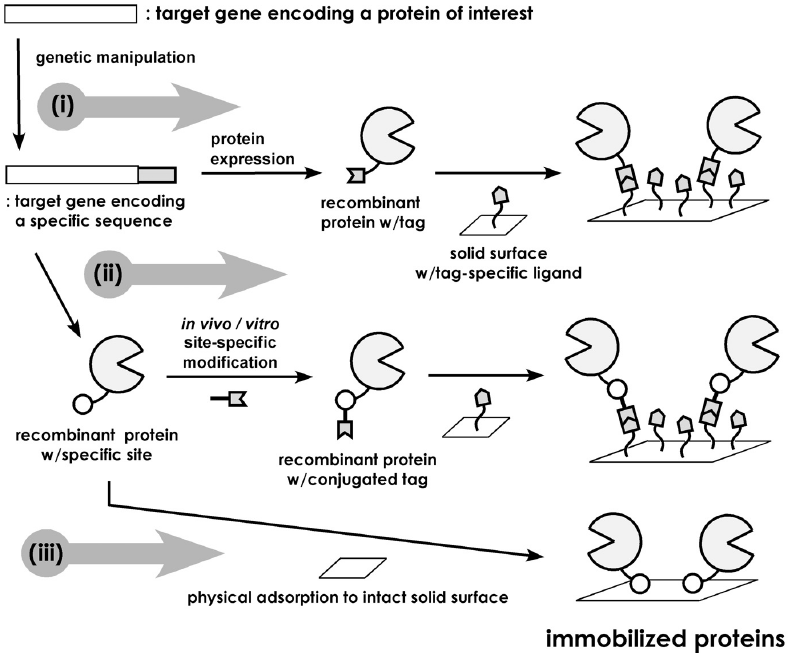 一方、一見何ら特異性がないように思えるタンパク質の物理吸着過程を、ペプチドタグの付加によって制御しようとする試みも報告されている (図1(iii))。物理吸着法はタンパク質の固定化における最もシンプルな手法であるが、通常、非特異的な吸着による機能損失は避けられない。Kobatakeらは、構造タンパク質であるelastin由来のヘキサペプチドに着目し、その12回繰り返し配列をグルタミン結合タンパク質のC末端に導入することで、その機能を保持したままポリスチレンプレート上に固定化することに成功している13)。Nakanishiらは、ポリスチレンに親和性を有するペプチドをファージディスプレイシステムにより取得し、これをモデルタンパク質 (glutathione S-transferase, GST) のC末端に導入することで、ポリスチレンへのGST固定化における活性保持率の大幅な向上に成功している14)。コンビナトリアル化学を利用して様々な担体に特異的かつ不可逆的に吸着するペプチドを取得することで、広範な担体に対して応用可能な部位特異的タンパク質固定化法となる可能性を秘めており、今後の展開が期待される。
