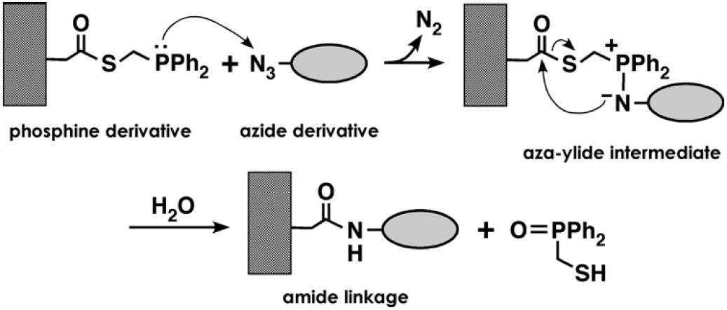 そのほかの有機化学的アプローチの1つとして、最近、ホスフィン-アジド間の共有結合形成を介した改変型Staudinger反応によるアミド結合形成反応19)の利用が検討されている。この手法は、現時点ではペプチドの固定化に応用されているのみであるが、固定化されたペプチドに高い親和性を有するタンパク質の固定化が可能であることが示されている20)(図3)。また、対象タンパク質にアジド基を有する非天然型アミノ酸 (アジドホモアラニン) を導入することで、上記反応による部位特異的な修飾も可能なことから21)、タンパク質の部位特異的固定化への応用も十分可能であると考えられる。