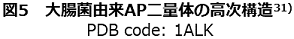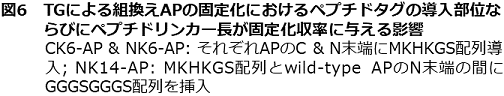 最近、筆者らは、Gln残基とLys残基の側鎖を共有結合的に架橋化するトランスグルタミナーゼ (TG) を利用したタンパク質固定化法を提案している24,25)。これまで、TGを用いたタンパク質固定化法はいくつか報告されているが、すべてnative酵素が用いられており、その形態は包括型26,27)か、あるいは適当な担体に物理吸着させた後、架橋化処理を施す手法28,29)が取られていた。そこで筆者らは、TGのペプチドタグ選択的タンパク質架橋化能力30)をより積極的に活用するため、TGの基質ペプチドを目的タンパク質のNあるいはC末端に導入することにより、導入ペプチドを介した共有結合的固定化を試みた (図4(b))。大腸菌由来のアルカリホスファターゼ31) (AP,図5) をモデルとした検討においては、反応性Lys残基を含む僅か6残基からなるペプチドタグ (MKHKGS) をN末端に付加し、反応性Gln残基に富む基質タンパク質であるカゼインにより表面修飾を施した担体を調製することで、ペプチドタグ特異的なAPの固定化が可能であった24,25)。TGを利用する共有結合的固定化法は、前述のペプチドタグを利用する利点と、酵素反応を利用する利点とを併せ持つ点で、既往の手法に勝ると考えている。本手法をさらに発展させるためには、TGの基質認識に最適なペプチド配列の取得と、その導入部位の最適化が必須であるが、最近、後者が固定化効率に大きな影響を与えることを見出している (図6)。また、TGはLys残基の代わりに様々な1級アミンも基質として認識するため、本固定化法は極めて汎用性の高い技術になる可能性を秘めている。