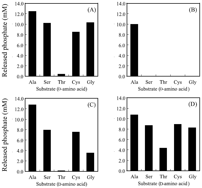 37℃での反応ではD-Ala、D-Ser、D-Thr、D-Cys、Glyだけが基質となり得たが (図4)、図6に示すように60℃の反応ではD-Gln、D-Lys、D-Arg、D-His、D-Val、D-Leu、D-Ile、D-Phe、D-Met、β-Alaに関しても基質となり得ることを示唆する有意なリン酸の遊離が確認された。しかしながら、37℃での反応で良好な基質であった5種類のアミノ酸を基質とした場合のリン酸の遊離量は他のアミノ酸を基質とした場合に比較して圧倒的に多いことから、60℃での反応による基質特異性の広がりは、活性化エネルギーの増大による反応速度の上昇に起因し、酵素と基質の親和性が変化したことによるものではないと推察している。