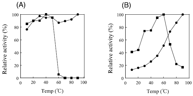 まず、TmDdlの温度安定性と反応最適温度をE. coli 由来EcDdlBと比較した。温度安定性は各温度で15分間インキュベート後、D-Alaを基質として37℃で20分間反応させ、生成するD-alanyl-D-alanine量を遊離リン酸の定量によって評価した。また、反応最適温度はD-Alaを基質として各温度で20分間反応させ、D-alanyl-D-alanineの生成量をHPLCにて直接定量することで評価した。図5より、EcDdlBが60℃から急激な活性の低下を示すにも関わらず、TmDdlは90℃まで活性の低下は認められなかった。TmDdlが好熱菌由来のDdlであることから、この結果は十分予想されることではあるが、高温域での反応温度が比較的自由に設定できることから物質生産に用いる酵素として有利な特性であると思われる。また、最適反応温度を評価した結果、TmDdlは温度の上昇に伴って活性も高まり、90℃までの範囲では最適値を持たなかった。しかしながら反応に必要なATPが80℃を超える高温域では化学的に加水分解を起こすため、その影響をほとんど受けない60℃を反応に適した温度と判断した。