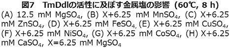 図7に示すように添加したほとんどの2価金属イオンはTmDdlの反応に阻害的な影響を及ぼすが、Mn2+、Zn2+を添加した場合にはいくつかの基質においてリン酸遊離量の増加が認められる。さらにD-Alaに対する活性を100%とした各基質に対する相対活性がMg2+のみの場合とZn2+を添加した場合とで大きく異なっているため、Zn2+の添加によって酵素と基質の親和性が変化したことが強く示唆される。現在、反応生成物の定量と当該酵素活性における金属イオンとの関係について詳細検討中である。