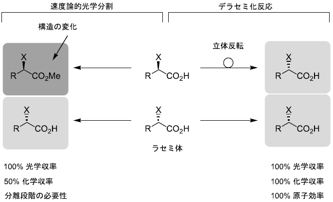 これに対してデラセミ化反応は、酵素がラセミ体基質のうち一方の鏡像体の立体配置のみを認識し、これを立体反転して他方の鏡像体へと変換する。つまり基質と生成物の間で違っているのは立体配置のみということになる。したがって光学的に純粋な化合物を100%の収率にて回収できる。また反応の前後で構造が同じであることから分離操作も必要なく、原子効率も100%というまさに夢のような反応である。デラセミ化反応はラセミ体からの光学活性体調製法としてこれまでの限界を乗り越える究極の方法であるといえる2)。