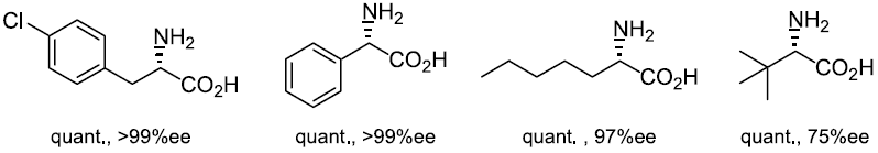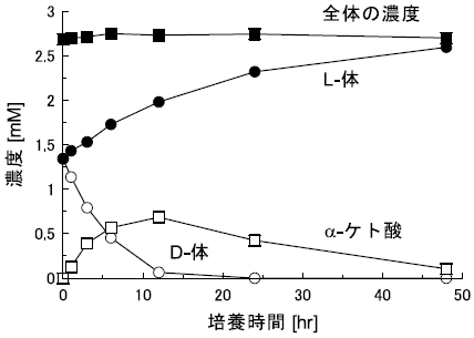 S. melilotiに対して4-クロロフェニルアラニンを作用させた際の経時変化を追跡した (図8)。反応中、α-ケト酸とアミノ酸の濃度の和はほとんど変化がないにもかかわらず、D体濃度は低下し、それに代わってL体濃度が上昇することが分かる。またα-ケト酸濃度の一時的な上昇も確認されたことから、中間体としてα-ケト酸を経由していると考えた。実際、α-ケト酸を基質とした場合には、反応の進行にしたがって濃度は低下し、それに伴ってL体のアミノ酸濃度が上昇することを確認している。