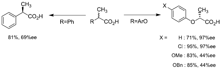 我々は、放線菌の一種Nocardia diaphanozonaria JCM 3208株が2-フェニルプロパン酸 (2-PPA) をデラセミ化し、R体へと変換する能力を有していることを確認した (図3)。この選択性はこれまでの例とは逆であり、R体の新たな調製法として利用できると考えた。この場合、菌体を培養しラセミ体基質を添加するだけというシンプルな操作にて光学活性体が得られた。しかし、本反応は平衡反応でありどちらの鏡像体から出発しても最終的に70%ee 程度に落ち着くことが分かった。また基質特異性も狭く、芳香族環上にフッ素原子が導入されただけでも反応は進行しなくなった。2位の置換基についてもメチル基よりも大きな置換基は受けつけずフッ素原子の導入された2-フルオロフェニル酢酸でのみ反応は進行した。一方、芳香族環と不斉炭素の間に酸素原子を挿入した2-フェノキシプロパン酸 (2-POPA) では高い選択性が発揮された。興味深いことに、本化合物に対する立体選択性は2-PPAに対するそれとは逆転していた。また芳香族環上のp-位はある程度の嵩高さまで許容された5,6)。