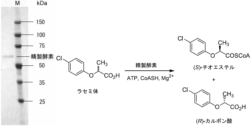 ところで菌体を破砕すると反応活性は速やかに消失した。つまり反応に関与する酵素は精製に耐えられるほどの安定性を有していなかった。そこで、より安定なデラセミ化酵素系を有する菌株を探索することとした。基質を2- (4-クロロフェノキシ) プロパン酸 (2-CPOPA) としてスクリーニングを行ったところ、新たな微生物を3種見出した。幸いなことにそれらの微生物のうち一株は、菌体を破砕してもデラセミ化活性を示し、また酵素も安定に存在することが分かった。本菌株の有する酵素活性はN . diaphanozonaria と比較すると低いが、2-PPAと2-POPA誘導体に対する立体選択性が同様であったこと、中鎖脂肪酸を添加すると反応が阻害されたことなどから、2種の菌株の酵素系は類似していると予想している (図5)。破砕上清を用いた場合には補因子としてATP, CoASH, Mg2+を要求したためチオエステル化を指標に酵素の精製およびクローニングを試みた。得られた酵素はバクテリア由来のアシル-CoAシンセターゼと非常に高い相同性を示すことがわかった。精製酵素を利用して2-CPOPAとの反応を試みたところ、反応はS体選択的に進行した (図6)。本菌株でも図2と同様にチオエステル体を中間体とする複合反応機構でデラセミ化が実現されると考えている。