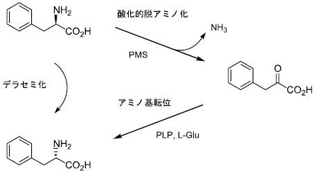 次に破砕上清を用いた検討を行った。菌体を破砕しても高いデラセミ化活性が残存していたが、透析操作を行うとその活性は著しく低下したことから反応には補因子が必要であることがわかった。検討の結果、アミノ酸からα-ケト酸への反応はD体選択的であり、補因子として電子受容体であるフェナジンメタサルフェート (PMS) を要求することが分かった。次に、α-ケト酸からアミノ酸への変換反応を確認したところピリドキサールリン酸 (PLP) とL-グルタミン酸を添加した際に反応が進行しL体のアミノ酸が得られた。最終的に、これら2種類の補因子を添加すれば破砕上清を透析しても各種アミノ酸に対して効率よくデラセミ化反応を進行させることができるようになった。このように、アミノ酸のデラセミ化反応はα-ケト酸を中間体とし、D体選択的脱アミノ化反応とL体選択的アミノ基転位反応という2段階にて実現されていることを明らかにした (図9)。