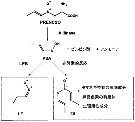 しかし、我々は「常温下において、PSAからLFが非酵素的に生成する」という通説は誤りで、この反応には、催涙因子合成酵素 (Lachrymatory factor synthase:LFS) と命名した新しい酵素の存在が不可欠であることを明らかにした。LFSの発現や活性を抑えることができれば、催涙性が抑制され、しかも、独特の匂い成分や生理活性成分へと変化するthiosulfinate (TS) の量は多い、高付加価値の「催涙性抑制タマネギ」を開発することも夢ではないと考えられる。