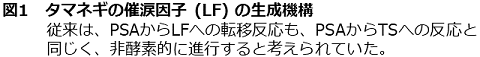 タマネギは、ユリ科ネギ属に分類される植物であり、エジプトでは、ピラミッドを造る時に、労働者に食べさせたと言う記録が残っている程、長い食経験がある野菜である。したがって、タマネギ中の成分や酵素に関する研究も古くから行われており、催涙因子 (LachrymatoryFactor:LF) に関しては、図1に示すように1-propenyl-cysteine sulfoxide (PRENCSO) と呼ばれる含硫化合物が、アリイナーゼによる分解を受けて不安定な中間体 (1-propenyl sulfenicacid:PSA) に変化した後、非酵素的に誘導されるという経路が提唱されていた1)。