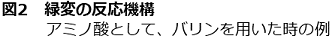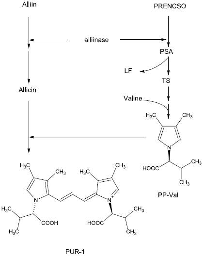 PRENCSOのアリイナーゼ分解物とアミノ酸が反応することにより、無色の色素前駆体 (Pigment Precursor:PP) が誘導され、このPPとアリシンが反応すると、緑変が誘導されることが確認できたので、我々はまず、PPの構造決定を試みた。PRENCSOをアリイナーゼで処理した後、バリンと反応させ、アリシンを加えた時に色素が誘導される性質を利用してPPを単離し、構造決定してPP-Valと命名した。さらに、精製したPP-Valとアリシンを混合し、反応の初期に誘導される赤紫色素を単離、構造決定してPUR-1と命名した。さらに、得られた結果と、PRENCSOの分解に関する既知の情報を元に、我々は緑変の反応機構を解明することに成功した (反応機構の概要を図2に示す)。