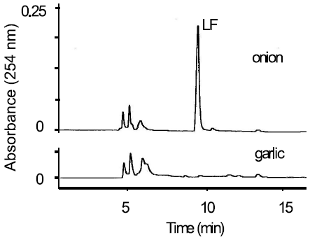 図1に示すように、PRENCSOをアリイナーゼで分解すると、PSAからLFとTSが生成すると報告されていた。PRENCSOがどちらの粗精製のアリイナーゼによっても充分に分解されているにも拘らず、TSの生成量に違いがあったので、次に我々はもう一つの反応生成物であるLFの量を比較した。その結果、PRENCSOをタマネギ由来の粗酵素で分解すると、LFが生成するが、ニンニク由来の粗酵素で分解すると生成しないことに気付いた。また、タマネギ由来でも、精製したアリイナーゼでPRENCSOを分解すると、LFが生成しなくなることを確認した (図4)。