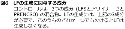 組換え体のLFS-3と精製アリイナーゼ、および精製したPRENCSOの3者を混合すると、LFが生成するが、この3成分のうちどれか1成分でも欠けると、LFは生成しなくなった (図6)。このことから、LFSは、PRENCSOからのLFの生成に必須な成分の一つであることが確認できた6)。次に、この3成分の反応順序を明らかにするため、限外ろ過膜を使用した実験を行った結果、予想通り、PRENCSOがアリイナーゼによって分解されて生じた分子量5,000 以下の成分にLFSが作用することによってLFが生成することが確かめられた。さらに、PRENCSOとアリイナーゼを反応させてから、LFSを作用させるまでの時間を長くすると、LFの生成量が減少した。これらの結果から、LFSの基質は、反応性が高く、不安定なPSAであることが強く示唆された。