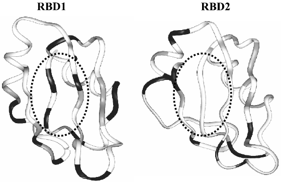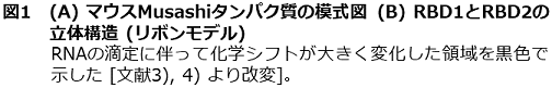まず、各RBDについて、NMRを用いて立体構造の解析を行った。RBD1およびRBD2について15N 標識されたサンプルを調製し、NOESYやTOCSYといったNMR測定を行った。NOESYでは空間的に距離が近い (5 Å以内) 水素原子間においてシグナルを得ることができる。一方、TOCSYにおいては、化学結合を介した水素原子間においてシグナルを得ることができる。このような特徴を基に、水素原子間の距離情報や二面角情報を抽出していき、構造解析に利用した。両ドメインの立体構造は、反平行型のβシートが2本のαへリックスによって裏打ちされた、RNP型に特徴的なフォールドを示していた3,4)(図1)。つまり、RBD1とRBD2は基本的には、よく似たフォールドを保持しており、立体構造の面からだけでは、両ドメイン間のRNA結合能の違いを見出すことはできなかった。そこで我々は、各RBDについて標的RNAとの相互作用領域を特定し、その領域における物性を詳細に解析することにした。