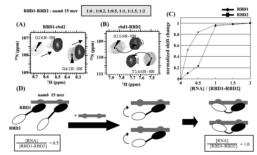 今回の実験では、RBD1-RBD2連結体に対して、numb 15merをモル比で1:0, 1:0.2, 1:0.5, 1:1, 1:1.5および1:2となるように滴定していった。RBD1-RBD2連結体のRBD1領域においては、1:0から1:0.5において大きく化学シフトが変化していた。しかし、それ以上RNAを加えても、化学シフトに変化がみられなかった (図3A)。一方で、RBD2領域においては、1:0から1:0.5までRNAを加えていっても、化学シフトにほとんど変化がみられなかった。しかし、さらにRNAを加え、モル比が1:1になると、急にシグナルが移動し、大きな化学シフト変化を示していた (図3B)。RBD1-RBD2連結体に対してnumb 15merが少ない状態 (1:0~1:0.5) では、RBD2領域がRNAに結合する前に、他のRBD1-RBD2連結体分子のRBD1領域が、結合してしまったと考えられる。そのため、RBD2領域はRNAとの相互作用に関与することができず、化学シフトに変化がみられなかったと考えられる。これはおそらく、RBD1の結合後さらにRBD2も結合するには、何らかの構造変化が必要で、しかもこの構造変化にはある程度の時間が必要とされるために生じた現象だと考えられる。一方で、RBD1-RBD2連結体に対してnumb 15mer が等量もしくはそれ以上存在している状態では (1:1~1:2), numb15mer中の結合配列がRBD1領域で占拠されることがないため、RBD2領域もnumb 15merに結合することができ、化学シフトに変化がみられたと考えられる (図3C)。