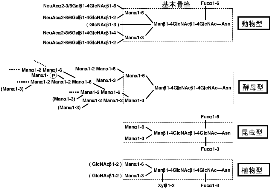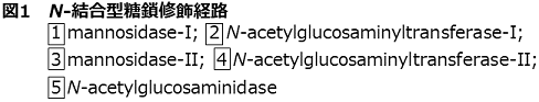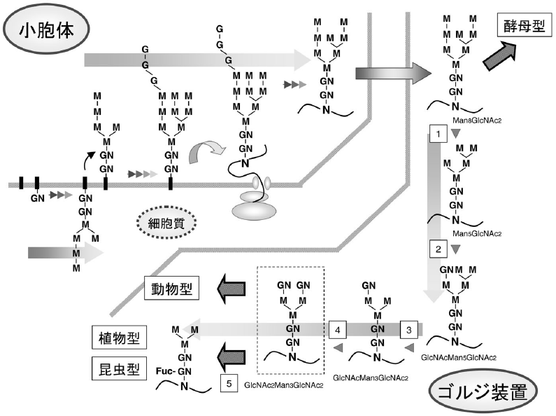 N-結合型糖鎖の生合成は、まず小胞体 (ER) 膜上で、ドリコールリン酸に結合した型で前駆体Glc3Man9GlcNAc2が合成されることから始まる (図1)。ドリコールリン酸上のGlc3Man9GlcNAc2は、翻訳が行われているペプチドのAsn-XSer/Thr のアスパラギン残基に糖鎖転移酵素により移される。糖鎖が付加したタンパク質は、ER内のglucosidase、mannosidaseによる分解を受けてMan8GlcNAc2となり、ERから出て、次のオルガネラであるゴルジ装置に輸送される。このステップまでは、酵母、昆虫細胞、動植物細胞で全く同じである。酵母は、ERから先の糖鎖付加機構が、他の細胞種と異なり、hypermannosy lationと呼ばれるマンノースが非常に多く付加した糖鎖構造へと進む。酵母以外の細胞では、Man8GlcNAc2となった糖鎖はMannosidase-Iにより分解を受けてMan5GlcNAc2型構造となり、N-acetylglucosaminyltransferase-I、mannosidase-II、N-acetylglucosaminyltransferase-IIと逐次的に付加と分解を受けて、GlcNAc2Man3GlcNAc2型構造となる。これ以降、昆虫細胞、動物細胞、植物細胞でプロセスが大きく異なる (図1, 2)。