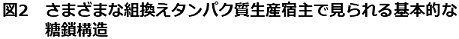 このように、宿主細胞によりそれぞれ糖鎖付加能力にバリエーションがある。そこで、各宿主に応じて、ヒト適応型の糖鎖構造を持った組換え糖タンパク質生産のために、さまざま技術が開発されている。