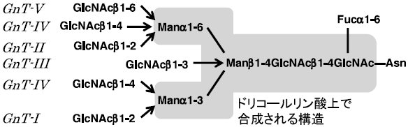 ヒトを含む哺乳動物やニワトリでは、β1,4-galactosyltransferaseやsialyltransferaseによりさらに糖鎖付加が起こり、NeuAc0-2Gal0-2GlcNAc2Man3GlcNAc2型構造となる。またN-acetylglucosaminyltransferase-IIIによりGlcNAc3Man3GlcNAc2型構造と、非還元末端側が3分岐型なる場合もある。さらに、N-acetylglucosaminyltransferase-IV、-V、-VIなどの酵素が作用すると、GlcNAc3-5Man3GlcNAc2型構造と、非還元末端側が3-5分岐型となる (図3)。また、α1,6-fucosyltransferaseがコア部分のN-アセチルグルコサミン残基にα1,6-結合でフコース残基を付加する。その結果、NeuAc0-2Gal0-2GlcNAc2Man3GlcNAc(α1,6-Fuc)GlcNAc型構造やGlcNAc3Man3GlcNAc(α1,6-Fuc)GlcNAc型構造となる。糖タンパク質によっては、非還元末端の方向にさらに糖が付加し、伸長していく場合もある。