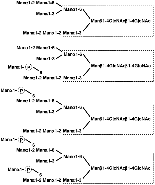 出芽酵母Saccharomyces cerevisiaeは、hypermannosylation化した糖鎖となるので、このプロセスに関わる遺伝子 (OCH1, MNN1) をノックアウトした変異体を作成することが必要である。産総研の地神らのグループは、och1 mnn1をベースに、哺乳類由来糖鎖修飾遺伝子を導入し、ヒト適応型糖鎖付加機能を持った酵母宿主を開発した7)。また、och1 mnn1酵母を用いてファブリー病の治療薬となる組換えα-galactosidase Aを生産した。この酵素の場合、糖鎖にマンノース-6-リン酸残基 (Man-P-) を有することが重要である。出芽酵母S. cerevisiae はマンノース-6-リン酸残基を付加する能力を持つので、組換え酵素にうまくマンノース-6-リン酸残基を付加できた (図4)8)。
