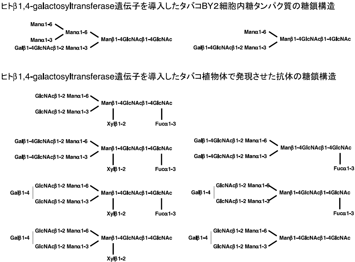 一方、植物のN-結合型糖鎖においても、糖鎖付加機能のヒト型化が試みられている。植物糖鎖の非還元末端には、N-アセチルグルコサミン残基が存在するものの、β1,4-結合したガラクトース残基が存在しない (微量ながらβ1,3-結合したガラクトース残基が存在する)17)。そこで、動物由来のβ1,4-galactosyltransferase遺伝子を導入すると、β1,4-結合したガラクトース残基を持つ糖タンパク質を合成できると期待できる。我々のグループはヒト由来β1,4-galactosyltransferase遺伝子をタバコBY2培養細胞に導入し、糖鎖構造を改変することに成功した (図5)18)。ガラクトース残基が付加した糖鎖が47%に達した。また、興味深いことに、植物特有であるであるキシロース残基やフコース残基が付加した糖鎖の含量が劇的に減少した。β1,4-galactosyltransferase遺伝子を導入することで、細胞内糖鎖付加機構に影響を与えたことになる。オランダのWageningenのグループ19)は、タバコ植物体でβ1,4-galactosyltransferase遺伝子を発現させ、さらに抗体遺伝子を導入して生産させた (図5)。この抗体の糖鎖には、ガラクトース残基が付加していたが、キシロース残基やフコース残基もが付加しており、植物培養細胞とは異なった。