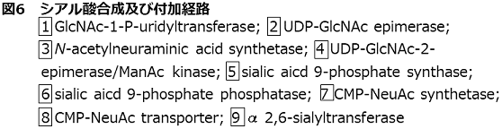 昆虫細胞では、米国のJarvisやBetenbaughらのグループが、ヒトとほぼ同じ糖鎖付加機能を持った宿主開発を精力的に行った10-13)。この宿主MimicTM Sf9は、昆虫細胞での組換えタンパク質生産に汎用されているSpodoptera frugiperda由来Sf9細胞をベースに、哺乳類の糖鎖修飾関連遺伝子を導入したもの14)で、現在市販されている。導入された遺伝子は5つで、N-acetylglucosaminyltransferase-I, N-acetylglucosaminyltransferase-II、β1,4-galactosyltransferaseや2種のsialyltransferaseである (図1酵素2から4)。ウマ由来黄体形成ホルモン/絨毛性ゴナドトロピンを生産させると、N-アセチルノイラミン酸 (NeuAc、シアル酸) は付加されていなかった15)。Sf9細胞はシアル酸合成能を持たないためCMP-NeuAcを合成できず、導入した2種のsialyltransferaseの基質が存在しないためであった (後述)。