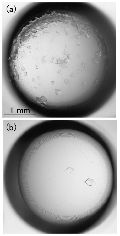 通常、核発生しない準安定領域の低過飽和溶液中で結晶化させることができれば、理想的であり、高品質結晶の育成につながる。そのため、種結晶から成長させる手法がよく用いられる。有機やタンパク質の結晶育成では、良質な種結晶がなく、種結晶育成より自然核成長で育成した結晶の方が高品質結晶を得られやすい1)。また、結晶が微小で脆く軟らかいこともあり、結晶の取り扱いが困難であるため、種結晶の導入に支障が生じる。つまり、種結晶育成に適していない。