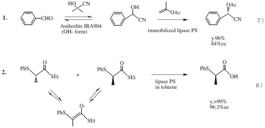 リパーゼが最も利用されるケースは、ラセミ体からの光学活性体の分割である。化学的に合成されたラセミ体から最大50%の収率で必要とする光学活性体を得る反応で、最も簡単な光学活性体の製法になる。適切な酵素が見つかれば短時間に光学活性体が得られる優れた手法であることはいうまでもない。しかし、分割反応であることから、コスト面では確実に不利になる。そこで基質をアルカリ条件下や金属触媒下でラセミ化させながら目的とする光学活性体を100%の収率に導くための工夫 (図2)7,8)をしたり、メソ体やプロキラルな基質からの製造プロセスを構築することで100%の収率を目指す例も見られる。単に分割反応で光学活性体が得られたという段階で終わるのではなく、ラセミ化反応と組み合わせなどさらに酵素利用の範囲を進展させる研究努力が必要である。酵素でもできるという反応に止まっては酵素が生かしきれていないのである。