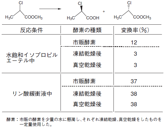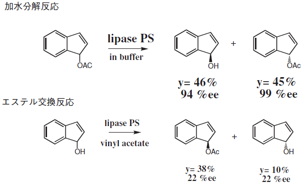 リパーゼは表面を構成するアミノ酸に疎水性のアミノ酸が多いことから、有機溶媒に対する親和性があり、一般の有機反応で使用される有機溶媒中で使用できる特徴がある。これが理由でリパーゼの利用が広がったといっても過言ではない。酵素の利用から見れば使用できる条件の拡大として大きな特徴ではあるが、逆に、化学触媒から考えれば有機溶媒中の反応はなじみのある反応の場である。すなわち、酵素という触媒を本来酵素が得意としない化学触媒が得意とする反応の場で、その能力を競うことになるのである。リパーゼも他の酵素と同じくアミノ酸からなるタンパク質であり、基本的には水系での反応が有利なのである。しかし、基質となる化合物が水に溶けないものであることから、不利な環境での競争とならざるを得ないのかも知れない。