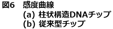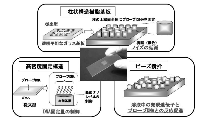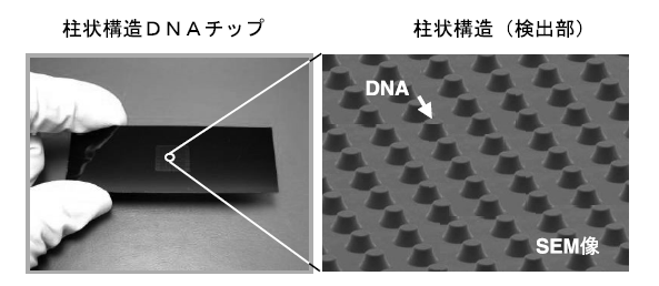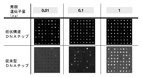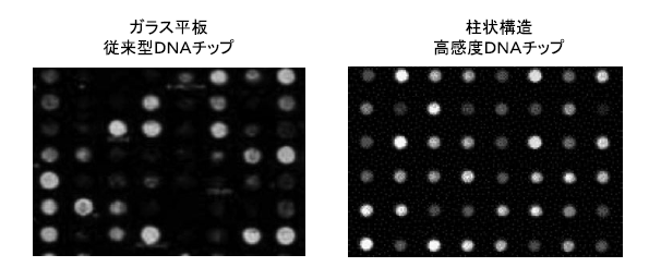 上述のとおり、今回開発した合成樹脂からなる柱状構造チップでは、表面加工・修飾の自由度が高く、柱状構造の上端面のナノレベルの設計を行うことによりDNAとの相互作用を制御する技術が開発できる。その結果、ターゲットDNAとのハイブリダイゼーション効率が最も良好な密度でプローブDNAを固定させることに成功している。また、DNAとの結合様式を種々設計できることを利用して、非特異なDNAの吸着抑制に有効な表面を実現している。これらの表面設計技術は、シグナルを向上させるとともにノイズレベルを低減させ、検出感度向上に有効である。