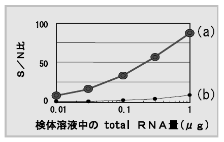 上記3つの技術をベースに作製したDNAチップの性能を以下に記す。図6にターゲットとして用いるtotal RNAの濃度を変化させた場合のシグナル/ノイズ比 (S/N比) を示す。また、図7に、0.01~1.0μg相当のtotal RNAを用いた場合の従来型チップと今回開発した柱状構造DNAチップの検出イメージを示す。従来の平坦なガラス製DNAチップと比較して、顕著なシグナルの上昇およびノイズ低減が観察された。従来型DNAチップでは0.01μg相当以下ではシグナル検出が困難であるにもかかわらず、今回開発した柱状構造DNAチップでは検出が可能であり、従来の平坦なガラス基板によるDNAチップと比較して、約1/100 のターゲットDNA量でもシグナルが検出できることが確認された。