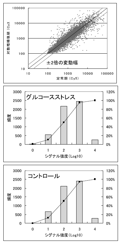 まず、酵母株を5 mlのYPAD培地で一晩、30℃で振とう培養 (前培養) した後、OD660=0.1になるように150 mlのYPAD培地に植菌、30℃で振とう培養した (本培養)。OD660が0.6にまで増殖したところで、本培養液を10 mlづつ分配して集菌、滅菌水で洗浄した後、各々集菌した細胞に10 mlのグルコースを含まない培地で細胞を再懸濁し、30℃で15~30分間穏やかに振とうした。コントロールとして、YPAD培地で細胞を再懸濁し、同様に振とうした。この再懸濁から集菌し得られた細胞を発現解析用酵母細胞とし、Schmittらの方法20)にしたがいtotal RNAを調製、競合ハイブリダイゼーションによる発現解析を行った。図8に結果をまとめるが、本DNAチップは低シグナルから高シグナルまで4桁近くのダイナミックレンジがあること、特にガラス平板の従来型DNAチップではノイズにより検出困難な低発現な遺伝子 (約20%) が本DNAチップにより解析対象となることが確認された。