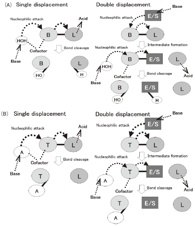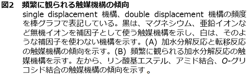 加水分解反応では、リン酸エステル結合、アミド結合、O-グリコシド結合が主要な標的共有結合となっている。したがって、こうした結合に対しては、触媒機構の種類も数多く存在している。図2Bに示すように、リン酸エステル結合とアミド結合の加水分解では、類似の傾向を示すのに対して、O-グリコシド結合の加水分解反応は、全く異なる挙動を示している。例えば、リン酸エステル結合とアミド結合の加水分解では、single displacement 機構では殆どの場合マグネシウムイオンや亜鉛イオンのような補因子が使われるのに対し、double displacement機構では殆ど使われない。それに対して、O-グリコシド結合の加水分解反応では、single displacement機構でも、殆どそのような補因子が使われない。こうした傾向の違いは、リン酸エステル結合とアミド結合がエステル結合であるのに対して、O-グリコシド結合は、非エステル結合であることを反映している可能性がある4)。