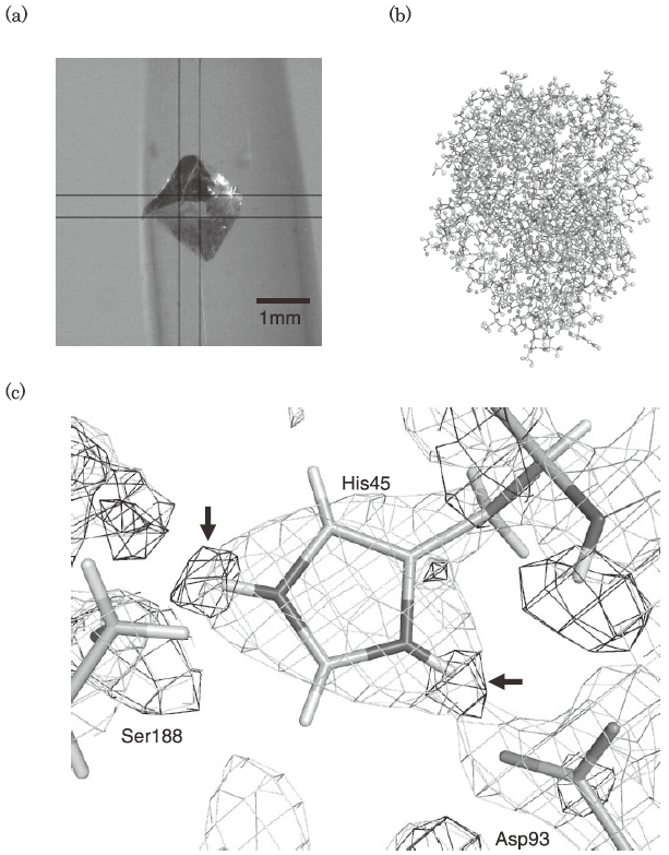 最近、我々は代表的なセリンプロテアーゼの一つであるブタ・膵エラスターゼの大型結晶をマクロシーディングを繰り返すことにより作成し (図2a)、2.3 Å分解能の中性子回折データの収集に成功した8)。現在、構造精密化中であるが、これまでに全原子の半分に相当する約1,700個の水素および重水素原子を確認済みで (図2b)、活性部位の電荷リレーシステムを構成する残基であるHis45のプロトン化の状態を確認している (図2c)。先に述べたようにX線回折法では、水素原子の観測のために1Åを超える高い分解能の回折データが必要である。しかしながら中性子回折では2.0Å台前半の分解能でも水素原子 (この場合は解離基の水素は重水素に置換されている) の存在を確認することができる。このように、中性子構造解析は従来のX線解析では困難であったによる触媒基の解離状態の観測を可能にする。この直接観測により、既知の酵素の触媒機構をより正しく理解することができるのはもちろん、反応機構が詳しく解明されていない新しい酵素の触媒機構の解明についても大変重要な情報が得られる。