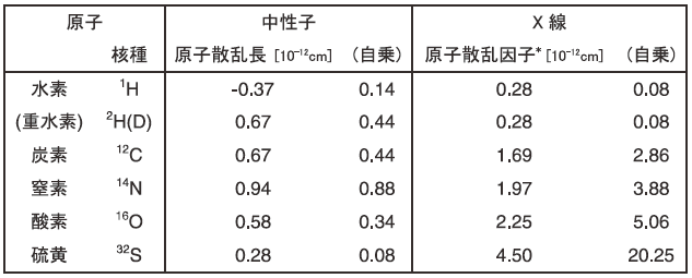 原子核を構成する粒子の一つである中性子はその名のとおり「中性 (電荷をもたない) 」粒子であるため物質に対する透過力に富むという特徴を有している。また、磁性粒子でもあるため、磁性を帯びた物質のスピン状態 (磁気構造) を得ることもできる。ただし、結晶からの回折現象に用いる際はX線と同様に波の性質を利用することになる。X線と中性子の回折現象の違いは、X線が原子核を取り巻く電子からの散乱であるのに対し、中性子は原子核そのものから生じる散乱であるところにある。表1にタンパク質を構成する各原子のX線および中性子の散乱効果を示す。X線の各原子との相互作用の強さは電子の数と比例し、その存在は電子密度として観測される。水素は炭素や窒素などに比べると電子数が少ないので、1Åを超える高い分解能の回折像を得てようやく水素原子の観測が可能となる。特に、水和水や解離基の水素の状態といったタンパク質の機能発現に関わっている水素原子については、0.8Åを上回る非常に高い分解能の解析をしなければ観測は難しい。西播磨のSPring-8、つくばのPhoton Factoryの両放射光施設では高輝度ビームラインの整備が進んでおり、これらのビームラインの稼動によりX線回折による水素の位置情報も含む構造解析例は増加していくと思われるが、原理的にX線が軽元素 (水素原子) の観測が苦手であるという事実は変わらない。