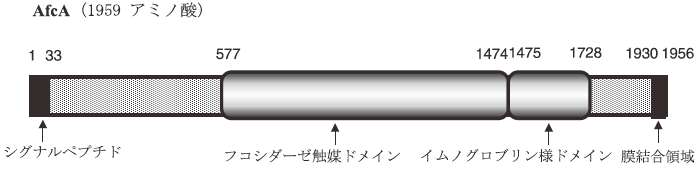 我々は、腸管より単離されたビフィズス菌の多くが分泌性の1,2-α-L-フコシダーゼを特異的に生産することを見出し、本酵素がビフィズス菌の宿主腸管内での生息に関わっているのではないかと推察した。先にシアリダーゼの遺伝子クローニングを行ったB. bifidum JCM1254株は本酵素の強い活性を有していたので、その遺伝子について大腸菌を用いた発現クローニングにより探索した11)。その結果、1,2-α-L-フコシダーゼ遺伝子をライブラリーより単離した。組換え大腸菌で発現した本酵素は1959アミノ酸残基からなる分子量約20万の巨大なタンパク質で、データベース上の機能未知タンパク質と相同性を示したが、いずれの既知のグリコシダーゼとも相同性が見出されない新規な酵素であった。N-末端側にはシグナル配列が、C-末端側には膜結合領域が存在していた (図2)。deletion解析によってその触媒ドメインを同定したが、その一次構造はCl. perfringensやBacteroides thetaiotaomicronなどの腸内細菌由来の機能未知タンパク質と高い相同性を示し、これらは新規なファミリーに属することが確認され、GH family 95が新たに設けられた。