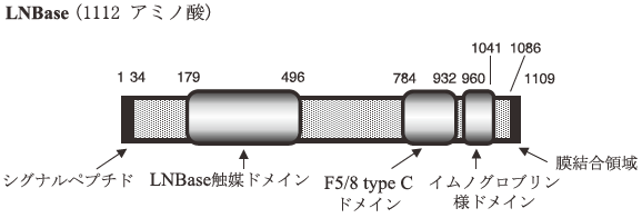 既に遺伝子クローニングが報告されている唯一の酵素であるStreptomyces sp. のラクト-N-ビオシダーゼ14) とLactococcus lactisのputativeなラクト-N-ビオシダーゼ15)の遺伝子との相同配列部分からプライマーを作成し、PCR法とコロニーハイブリダイゼーション法を組み合わせて遺伝子の全長を取得した。得られた遺伝子は大腸菌にて発現し、ラクト-N-テトラオース (Galβ1-3GlcNAc β1-3 Galβ1-4Glc) をラクト-N-ビオースとラクトースに分解することを確認した。本酵素はN-末端にシグナルペプチド、C-末端に膜結合領域を持つ1112アミノ酸残基からなるタンパク質で、GH family 20に属する糖質分解酵素と相同性を持つ触媒ドメイン、ガラクトースへの結合が示唆されるF 5/8 type Cドメイン、それにIg-likeドメインの三つのドメインから構成されていた (図4)。本酵素の活性についてp-ニトロフェニル (p-NP) 基質を用いて調べると、p-NP-ラクト-N-ビオースに高い特異性を示し、p-NP-ガラクト-N-ビオース (Galβ1→3GalNAc) に対してもp-NP-ラクト-N-ビオースの約35%の活性を示した。しかし、天然基質からはガラクト-N-ビオースをほとんど加水分解しなかった。