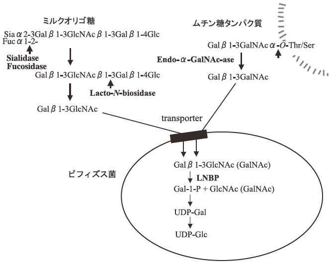 Galβ1-3GlcNAc+Pi→Gal-1-P+GlcNAc生成したガラクトース-1-リン酸 (Gal-1-P) はルロワール経路 (Leloir pathway) と呼ばれる代謝系で代謝され、グルコースやガラクトースの糖供与体であるウリジン-ジリン酸グルコース (UDP-Glc) やウリジン-ジリン酸ガラクトース (UDP-Gal) が生成される。すなわち、ビフィズス菌はラクト-N-ビオースを加リン酸分解して、生体内の重要な化合物である糖供与体=糖ヌクレオチドを得ると考えられる。ラクト-N-ビオースホスホリラーゼはラクト-N-ビオースのみならず、ガラクト-N-ビオースにも作用する。我々は腸管の粘膜ムチンに広く存在するムチン型糖鎖=ガラクト-N-ビオースをタンパク質から遊離する特異的なエンド型グリコシダーゼのエンド-α-N-アセチルガラクトサミニダーゼ (Endo-α-GalNAc-ase) をビフィズス菌の多くが分泌生産することを見出している17)。このような事実より、ビフィズス菌ではEndo-α-GalNAc-aseによって腸管のムチンよりガラクト-N-ビオースを遊離し、一方、ラクト-N-ビオシダーゼによってミルクオリゴ糖からラクト-N-ビオースを遊離して、それら二糖を菌体膜に存在するトランスポーターにより菌体内に取り込み、次いでラクト-N-ビオースホスホリラーゼの作用によって糖ヌクレオチド生成経路と繋がると推察される (図5)。したがって、この代謝経路は糖供与体を生合成する経路であると言う点でビフィズス菌の生育のために極めて重要な経路と考えられる。