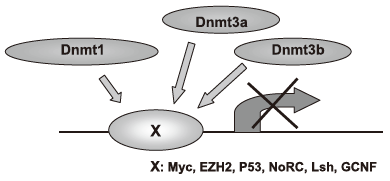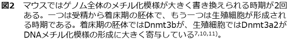 Dnmt1は後述のように、一旦形成されたメチル化模様を維持する型のDNAメチルトランスフェラーゼと考えられているが、最近ゲノムにメチル化模様を新規に書き込む可能性が指摘されている16)。これまでもin vitroでは新たにメチル化模様を書き込むde novo型の活性を持つことが報告されているので、そのde novo型の活性が生体内でも発揮されていることは充分あり得る。