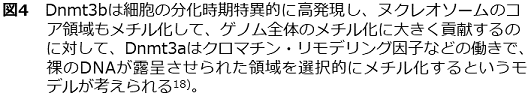 Dnmt3aとDnmt3bは、生体内では一部ゲノムの異なる領域をメチル化しているが、in vitro で裸の2本鎖DNAを基質とした場合はお互いによく似たDNAメチル化活性を示す8,17)。しかし、生体内でDNAが組み込まれているヌクレオソームをメチル化受容基質として両酵素の活性を比較すると、両者の違いは際立つ。両酵素ともヌクレオソームの形成によって活性が著しく阻害されるが、Dnmt3bがヌクレオソームのコア領域をある程度メチル化できるのに対して、Dnmt3aはその活性が著しく低い。一方、Dnmt3aはヌクレオソーム内でDNAが裸で露出している領域を効率よくメチル化する。Dnmt3bの発現量が時期や細胞特異的に厳密に調節されているのに対して、Dnmt3aは、発現量は低いものの様々な細胞でユビキタスに発現している。発生期での発現のタイミングや、生殖細胞で見られた組織特異的な発現様式の違い、それとヌクレオソームDNAをメチル化する活性の違いが総合されることで、両酵素がゲノムの異なる領域をメチル化していると考えられる18)。Dnmt3bが主に繰り返し配列を含むゲノム・ワイドな領域のメチル化模様の形成に、そして、Dnmt3aが特定領域のDNAメチル化に寄与していると考えたい (図4)。