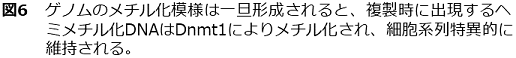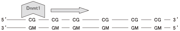 DNAのメチル化修飾がエピジェネティックスの定義を満たすのは、その模様が次世代の細胞に伝えられる機構があることによる。ゲノムに形成されたメチル化模様が次世代の細胞に維持されるのは、最初にcDNAが単離されたDNAメチルトランスフェラーゼDnmt1の働きによる。Dnmt1はDNA複製やDNA修復直後に生じる2本鎖DNAに存在する、片方がメチル化されたCpG対 (ヘミメチル化DNA、図6) を選択的にメチル化して、DNAメチル化模様を細胞系列特異的に維持している。Dnmt1遺伝子のノックアウト・マウスでは、着床後にゲノム全体に起きるメチル化修飾の時期にメチル化インプリントの消失や不活性X染色体の再活性化が引き起こされ、胎生9.5日で致死となる。