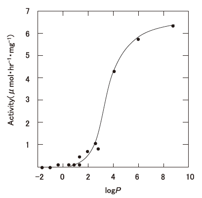 このように、logPow値は非常に有効なパラメーターである。しかし残念なことに、重要な多くの極性有機溶媒群が酵素触媒反応には適さないlogPow<2の溶媒 (蛋白質の変性剤) に該当するのも事実である。