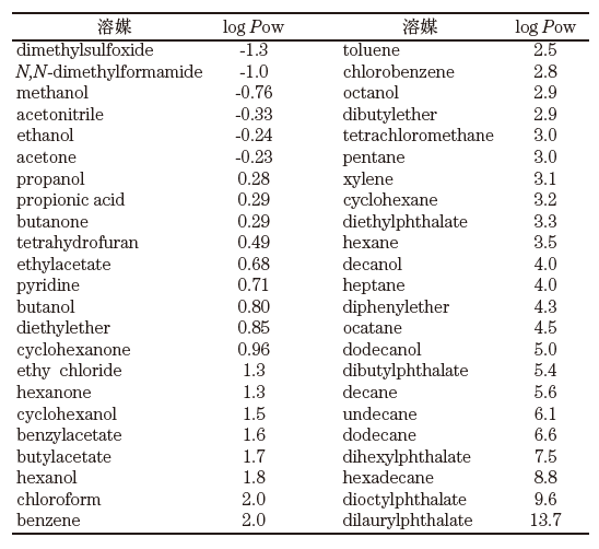 表1 よく使用される有機溶媒のlogPow値