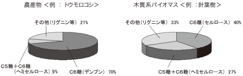 しかしながら、木質系バイオマス (セルロース、ヘミセルロース) を原料としたエタノールの生産は、糖質原料からの製造に比べ難しいと言われている。燃料用エタノールを製造する原料として糖蜜やデンプン質を原料とする場合は、お酒の醸造と基本的には同じであり、従来技術の応用が可能である。それに比べ木質系バイオマスは、糖の抽出に酸加水分解やセルラーゼによる糖化が必要であり、更には酵母では発酵できない糖があるため特殊な発酵菌が必要となり、革新的技術と高い製造コストへの対応が余儀なくされる。また、農作物と木質系バイオマスは成分が異なり、エタノールの収率に差が出ることも課題のひとつである。図1にデンプン質系と木質系バイオマスの組成の一例を示す。