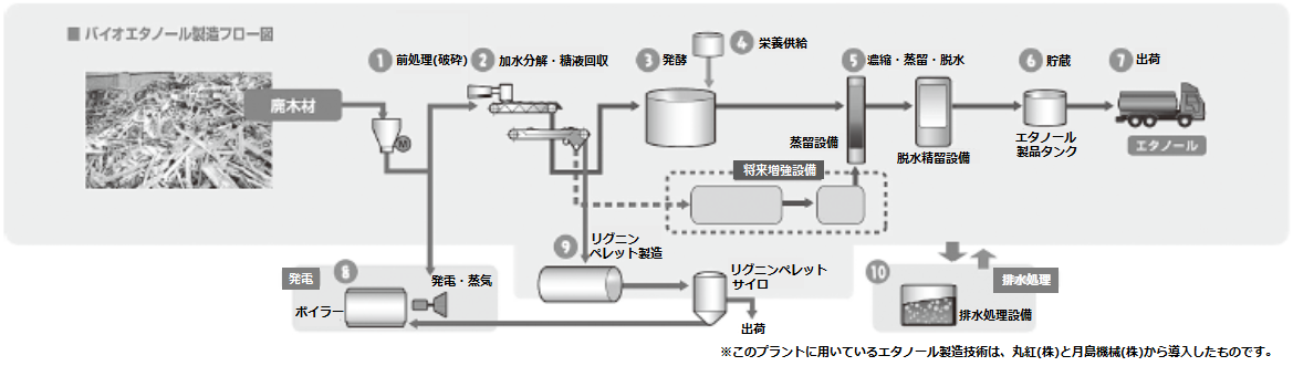 関西圏で排出される建設廃木材・パレット・剪定枝などの廃木材を年間4~5万トン集め原料とし、JASO (自動車技術会) 規格に適合する燃料用エタノールを製造している。商用設備としては、原料中のヘミセルロースから年間1,400 kLの燃料用エタノール製造能力を有し、将来の酵素法導入によるセルロースからのエタノール製造設備増強を考慮した計画としている。