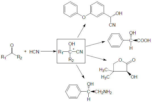 光学活性シアノヒドリンは、ヒドロキシニトリルリアーゼ (hydroxynitrile lyase, HNL) により、アルデヒドまたはケトンに青酸を付加させることによって合成される化合物である。本化合物は比較的簡単な有機合成を組み合わせることによって多岐にわたる光学活性化合物へ誘導体化できるため、光学活性医農薬合成用の中間体としての応用が期待されている (図1、図2)。