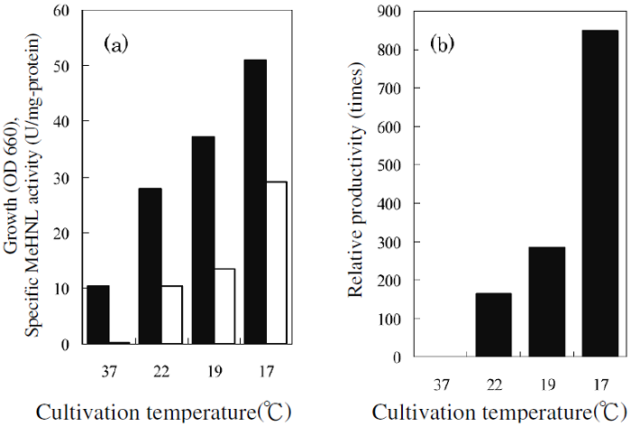 さらに、低温培養では、菌体収量も大幅に増加した。至適培養温度である37℃における培養では、短期間に溶存酸素が枯渇してしまうが、低温培養では、代謝が遅くなり、酸素消費速度が遅くなるために溶存酸素の枯渇が起こり難くなることがわかった。特に17℃で培養を行った場合には、37℃の培養に比べ、約5倍の菌体収量が得られた。低温培養下では、培養系内が好気的に維持されたため、基質が好気的に消費されたことでより多くのエネルギーが獲得できた結果、菌体量が増加したと考えられる。17℃の低温培養法によって、菌体収量は5倍増加し、単位菌体量当たりの酵素活性が170倍に増加したため、単位培養液当たりのMeHNL生産性を850倍に向上させることができた (図4)。