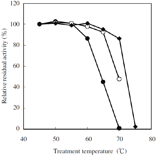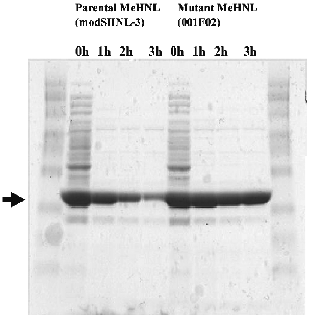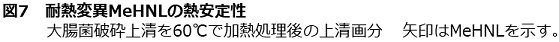 図7には、組換え大腸菌破砕液を加熱処理した際の上清のタンパク質組成変化を示した。天然型MeHNLの場合は、大腸菌由来の共雑タンパク質とともにMeHNLが熱変性し不溶化しているが、耐熱MeHNLでは、共雑タンパク質を選択的に変性除去することができ、加熱処理だけでMeHNLを精製できることが示唆され、工業規模での酵素精製がより簡便に実施できるようになった。