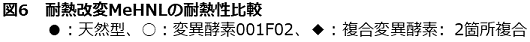 変異酵素の耐熱性を比較したところ、野生型酵素に比べ約5℃の耐熱性の向上が見られた。さらに変異部位を複合したところ、耐熱性は相加的に向上し、耐熱性変異2箇所を複合したものでは約10℃の耐熱性向上が見られた (図6)。また、耐熱変異MeHNLは有機溶媒に対する安定性も向上していることがわかった。MeHNLによる光学活性シアノヒドリン合成反応は、基質および生成物が水に難溶な場合が多く、高濃度反応のためには、有機溶媒系での反応が必須である。有機溶媒に対する安定性が向上したことは、実用上大変好ましい結果であった11,12)。