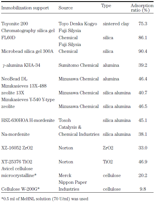 筆者らは、MeHNLを簡便に固定化することができ、強い攪拌を行わなくとも容易に均一分散でき、しかも、回分反応ばかりではなく、大量生産に適したカラム充填型連続反応への適用が可能な固定化MeHNLの開発を行った。固定化担体の探索の結果、シリカゲルなどの多孔性無機微粒子がMeHNLの固定化担体として最適であることを見出した (表1)10)。